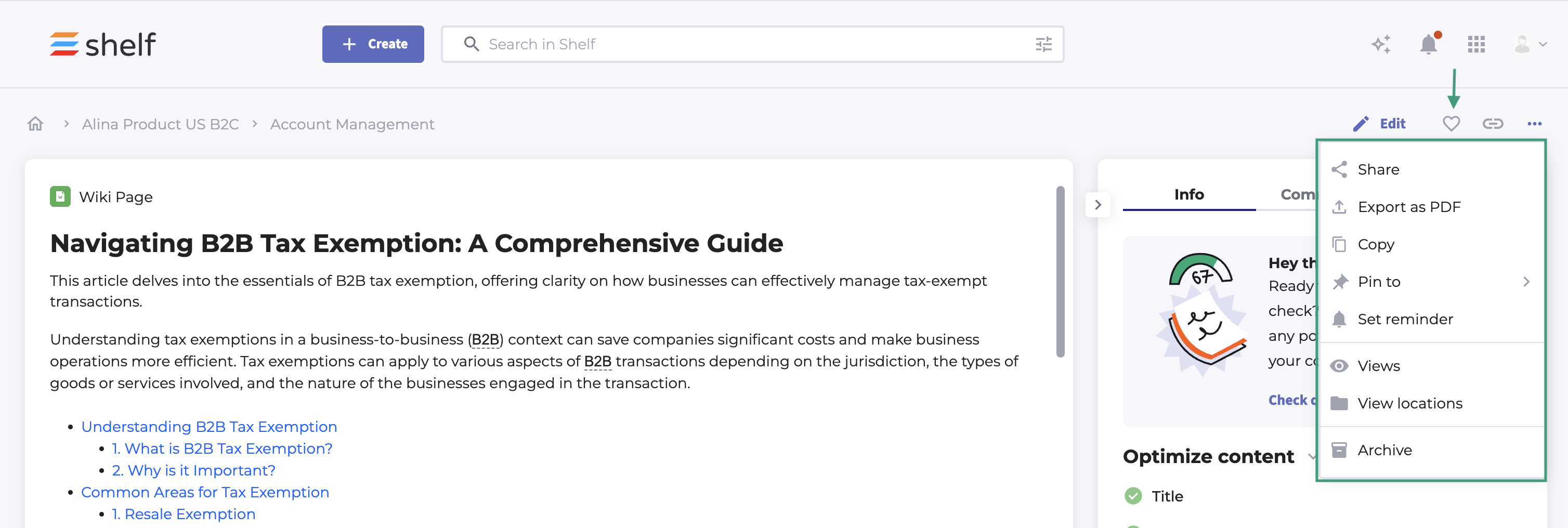 The Context menu (three dots) on the Gem page allows users to Share the content via email, Export as PDF, Copy, Pin to, Set a reminder, view who has seen your Gem (Views), see the location of the content, and Archive. The Favorite action is now available as a separate heart icon next to Edit.