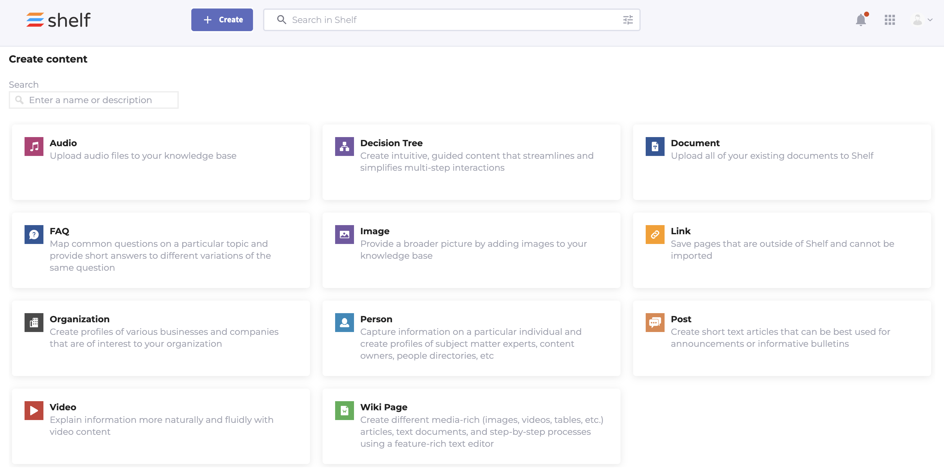 Shelf offers great content creation flexibility - there is a big variety of article types that you can use to curate knowledge.