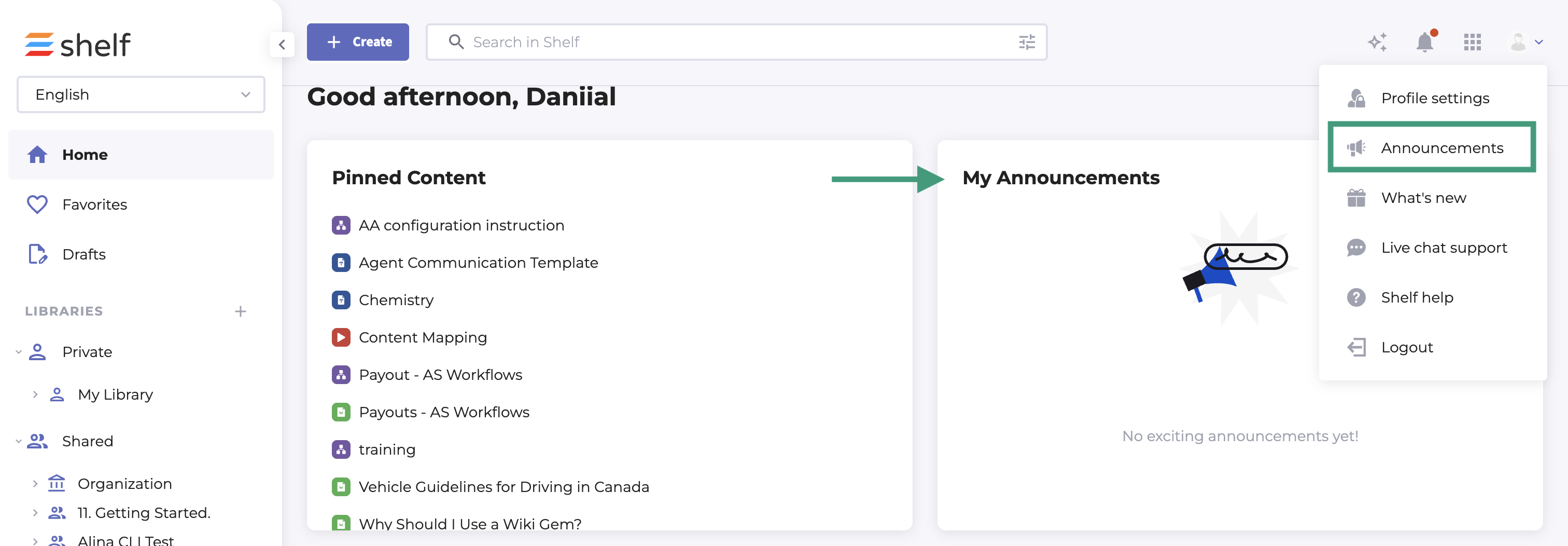 You can view all of your current and past Announcements in the My Account section by going to the menu option at the top or choosing View More from the home dashboard widget: